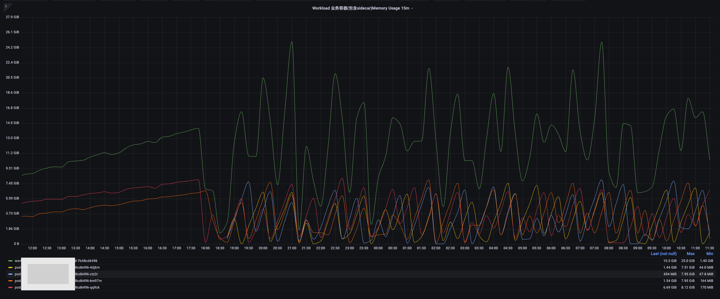 当游戏发布后大量流量与事件涌入,指标也立即呈现出了剧烈的周期性波浪,表明此刻每个 pod 的内存快速飙升、又因为达到限制而被重启……这个过程反反复复,也印证了线上问题的实际表现。(证据三)