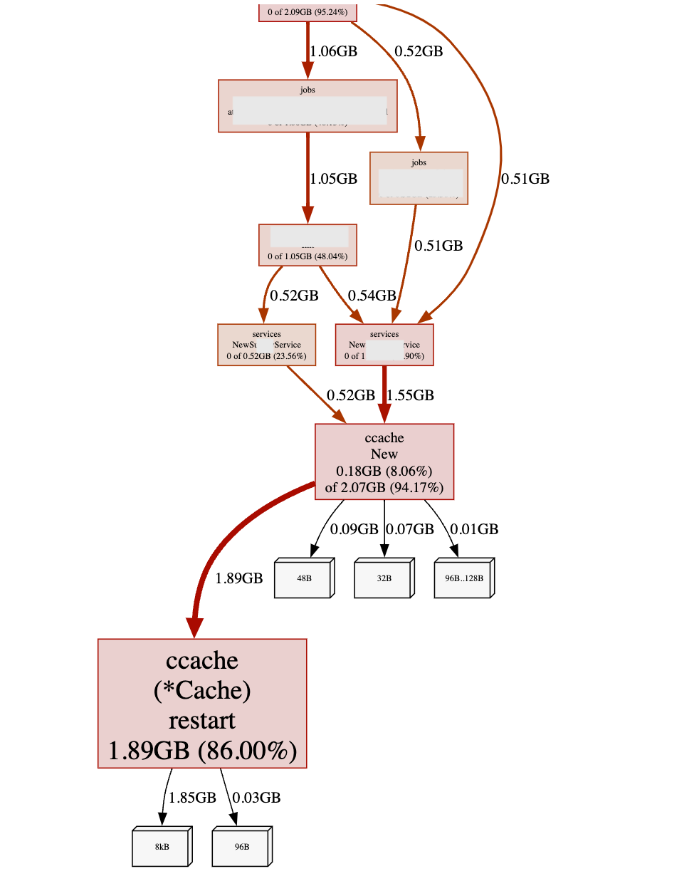 我每隔一段时间都在同一个 pod 中打点一个 heap 文件。通过对比,我发现 ccache(*Cache) restart 的内存消耗随着时间不断膨胀,显得非常可疑。